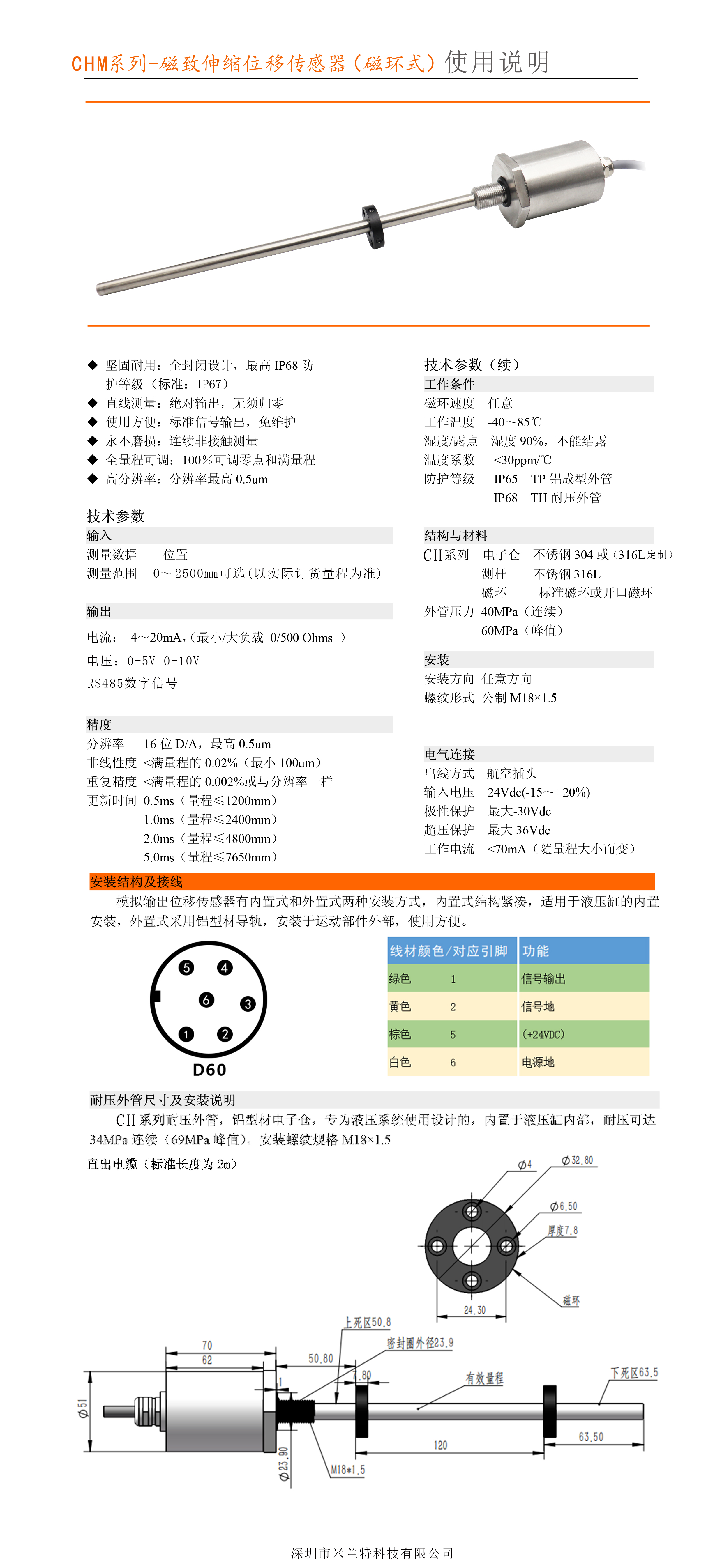CHM系列不銹鋼防水耐壓式磁致伸縮位移傳感器油缸內(nèi)置行程傳感器磁環(huán)式