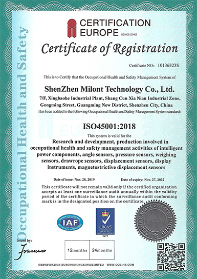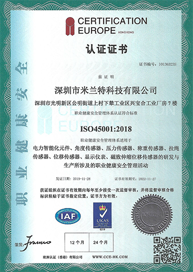 米蘭特ISO職業(yè)健康安全管理體系認證證書