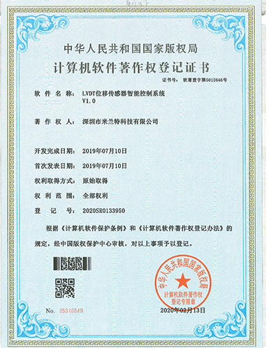 米蘭特LVDT位移傳感器智能控制系統(tǒng)V1.0軟件著作權登記證書