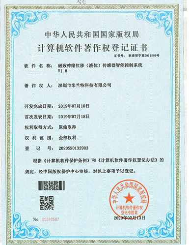 米蘭特磁致伸縮位移傳感器智能控制系統(tǒng)V1.0軟件著作權登記證書