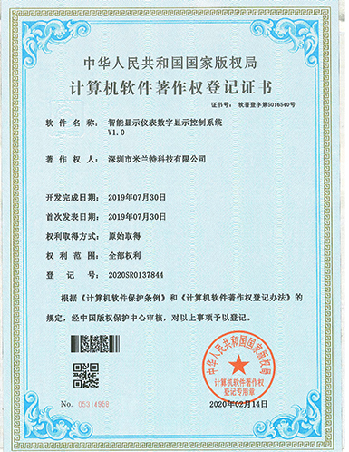 米蘭特智能顯示儀表數字顯示控制系統(tǒng)V1.0軟件著作權登記證書